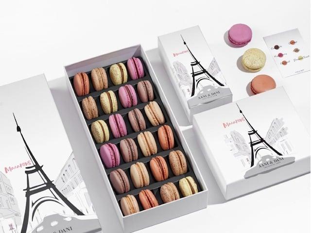 An elegant box containing delicate and colorful macarons with distinctive flavors.