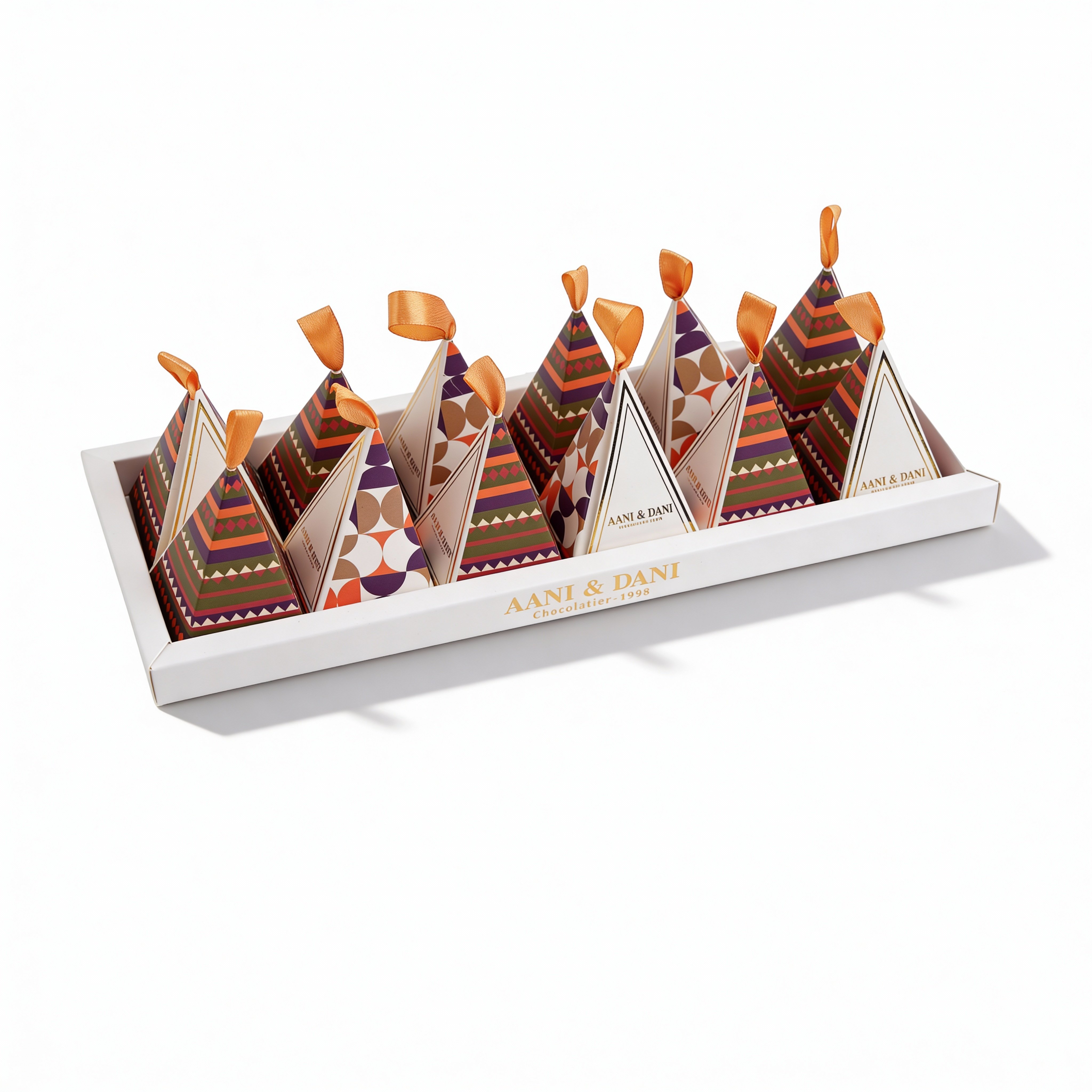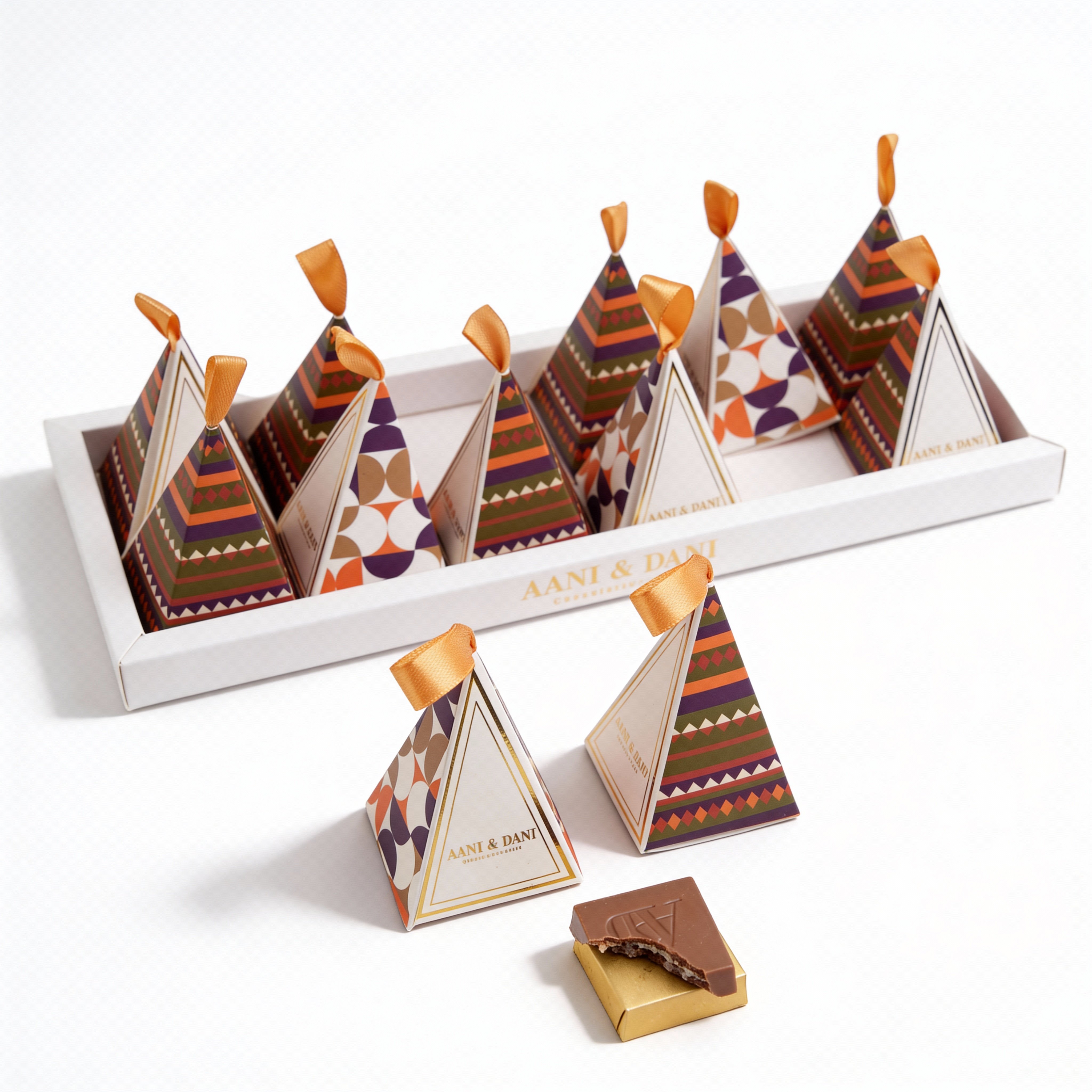 A pyramid-shaped treat box containing 12 pieces, or approximately 135 grams, of delicious coated chocolate.